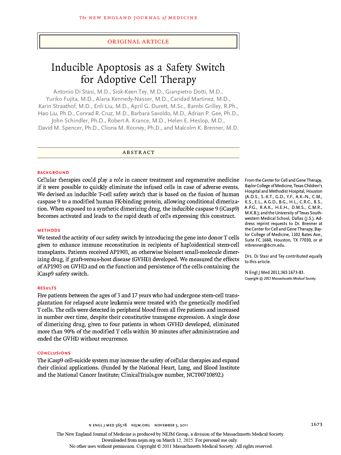 This study presents a novel inducible apoptosis system (iCasp9) as a safety switch for adoptive cell therapy. The system allows for the rapid elimination of genetically modified T cells in case of adverse events, such as graft-versus-host disease (GVHD) after haploidentical stem-cell transplantation. The study demonstrates that a single dose of the dimerizing drug AP1903 eliminates over 90% of modified T cells within 30 minutes, effectively resolving GVHD without recurrence.