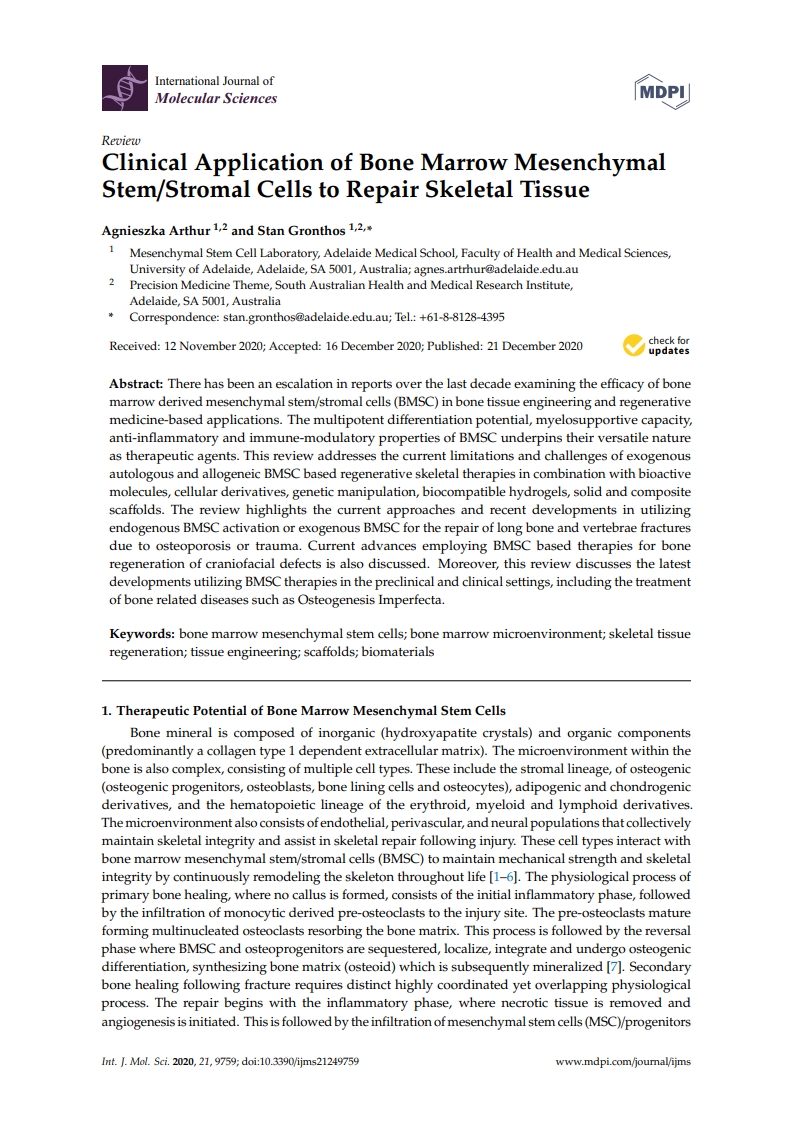 뼈 조직 공학 및 재생 의학 기반 응용 분야에서 bone marrow derived mesenchymal stem/stromal cells (BMSC)의 효능을 조사하는 보고서가 증가했습니다. BMSC의 다능성 분화 가능성, 골수 지원 능력, 항염증 및 면역 조절 특성은 치료제로서의 다재다능한 특성을 뒷받침합니다. 이 논문은 생리 활성 분자, 세포 유도체, 유전자 조작, 생체 적합성 하이드로겔, 고체 및 복합 스캐폴드와 결합된 외인성 자가 및 동종 BMSC 기반 재생 골격 요법의 현재 한계와 과제를 다룹니다. 이 논문은 골다공증 또는 외상으로 인한 장골 및 척추 골절의 복구를 위해 내인성 BMSC 활성화 또는 외인성 BMSC를 활용하는 현재 접근 방식과 최근 개발을 강조합니다. 두개안면 결손의 뼈 재생을 위해 BMSC 기반 치료법을 사용하는 현재의 발전도 논의됩니다. 또한 골형성 부전증과 같은 뼈 관련 질병의 치료를 포함하여 전임상 및 임상 환경에서 BMSC 요법을 활용하는 최신 개발에 대해 논의합니다.